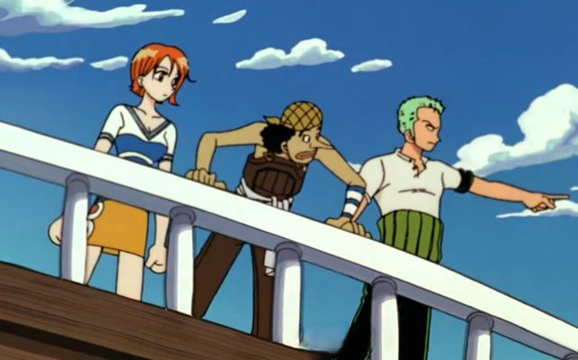 路飞回过头来,索隆便指了过去。