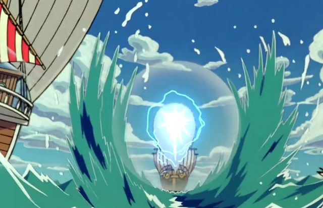 那未知光线的威力巨大,眼看路飞即将被击中,可可跳下索隆的怀抱瞬移到路飞面前就替他挡下一击,但却被那巨大的海浪给拍到水里去了。