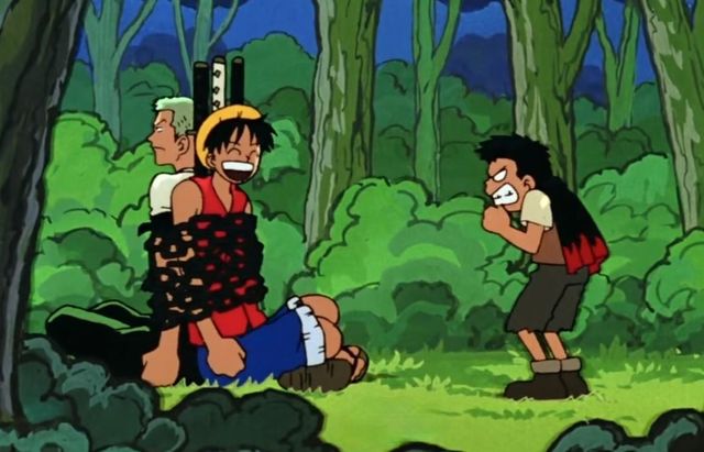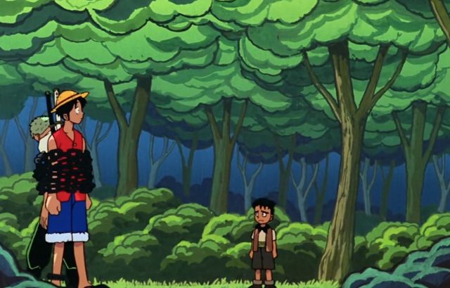 路飞带着晕过去的索隆和绑在他身上的可可,在森林里跑来跑去,一直都没有找到回到那个岸边的路,最后,也不知道自己到底是去了哪里。就连可可与飞男,也不知道这里到底是哪里,因为没有人会对自己从来没有去过的地方那么的熟悉,所以,这四个人,一起迷路在这片森林里了。
