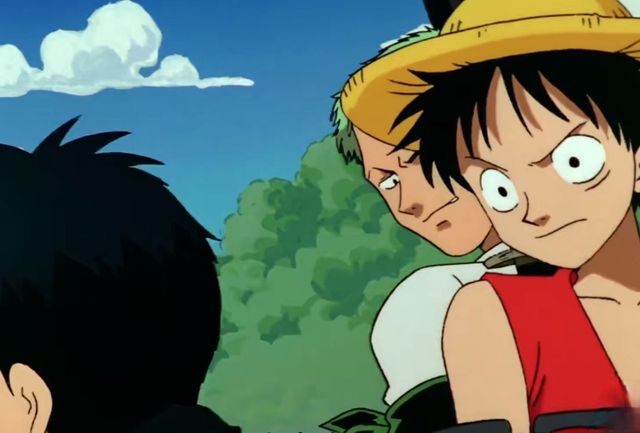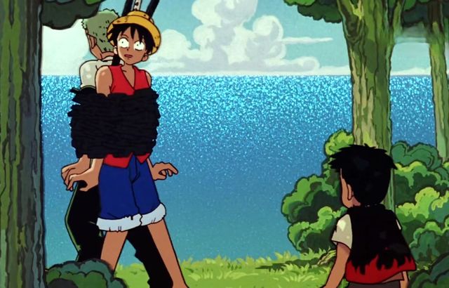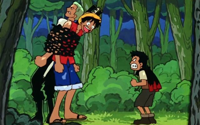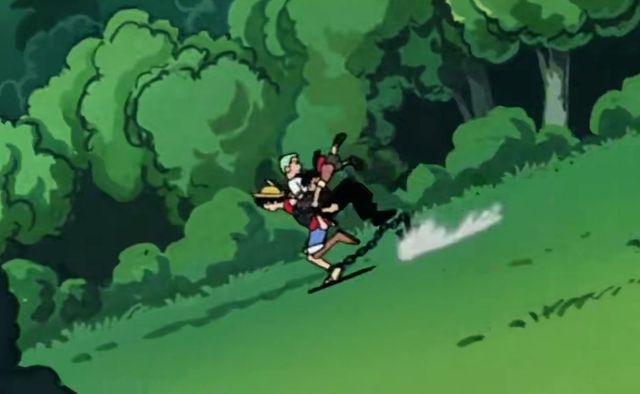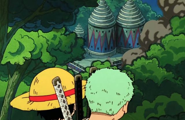 正当索隆想要说什么的时候,大地在不停的晃动,而且宇宙也有爆炸的声音响起,不光是这样,还有无数的硝烟弥漫。路飞背起索隆就朝着冒着黑烟的地方跑去,因为如果让索隆这个路痴带路的话,大家又不知道会跑到哪里去了。路飞迷路的程度,倒没有索隆那么严重,至少在知道自己的目的地的时候,是不会因为分不清左右而迷路的,索隆,在以后的航海中,会大大的显露自己的路痴属性。
