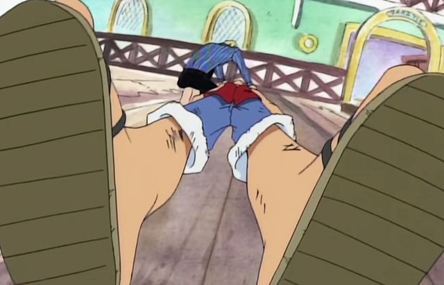 就在山治思考的功夫,路飞双脚缠住克利克的头。