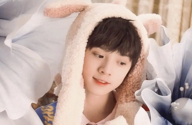 他带着兔耳朵
