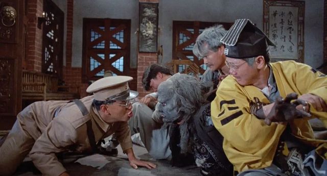 当九叔和秋生赶来用墨斗线将僵尸弹到大厅,接着九叔拿起一把大刀直接向僵尸头砍去,怎知僵尸变得刀枪不入,反手将九叔逼得连连后退,九叔也受了伤,你忍着身上的疼上前和秋生扯出墨斗线把僵尸弹开救出九叔。