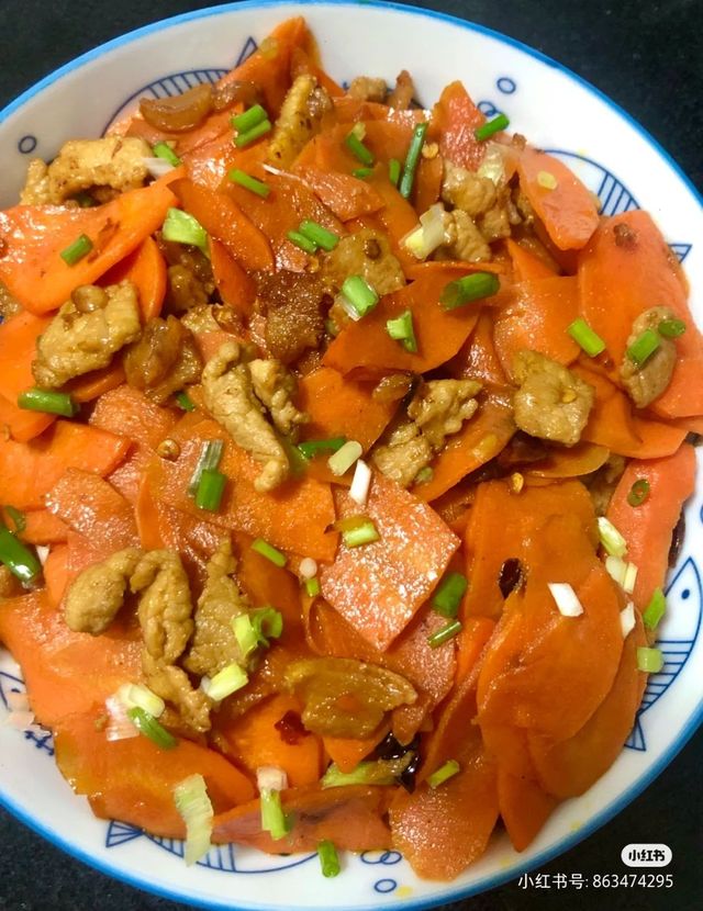 桌子上有:有红烧肉,茄子,豆角,胡萝卜炒肉。