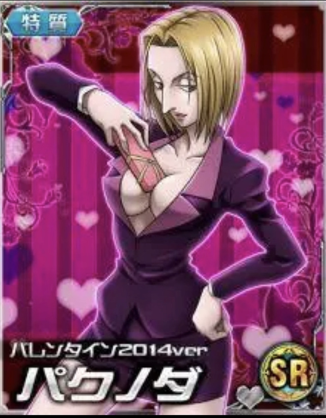 派克派克诺妲,幻影旅团团员,团员号码9,特质系能力者。眼神冷漠,具有魔鬼般的身材的女性。在旅团之中负责调查与问话。外表看似冷酷,其实个性执着热情。团长被酷拉皮卡抓走时,她刻意违反旅团的规矩,使用念能力记忆弹,牺牲自己。