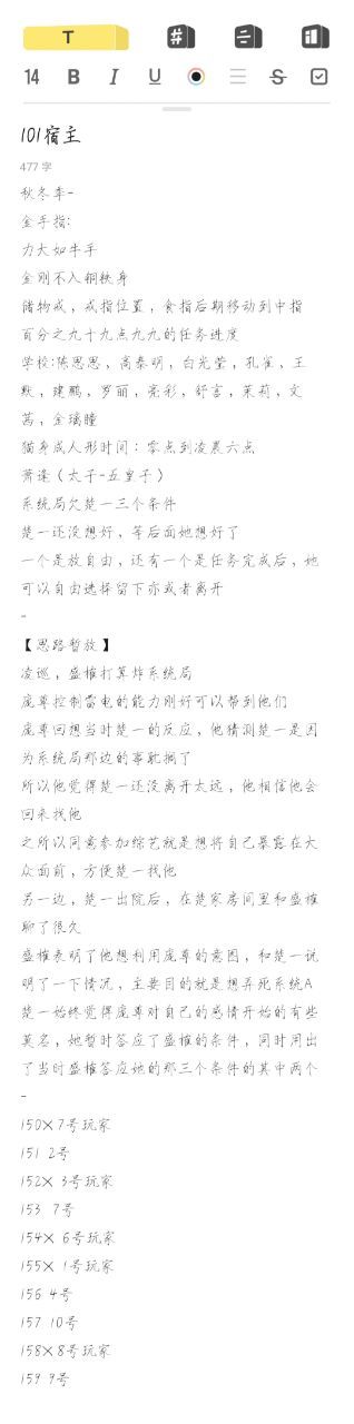 隔壁大佬的小纸条比这个多,宿主剧情很单一写起来比较轻松吧,也没有埋下太多伏笔什么的,所以不是很重要的细节也就不需要记啦