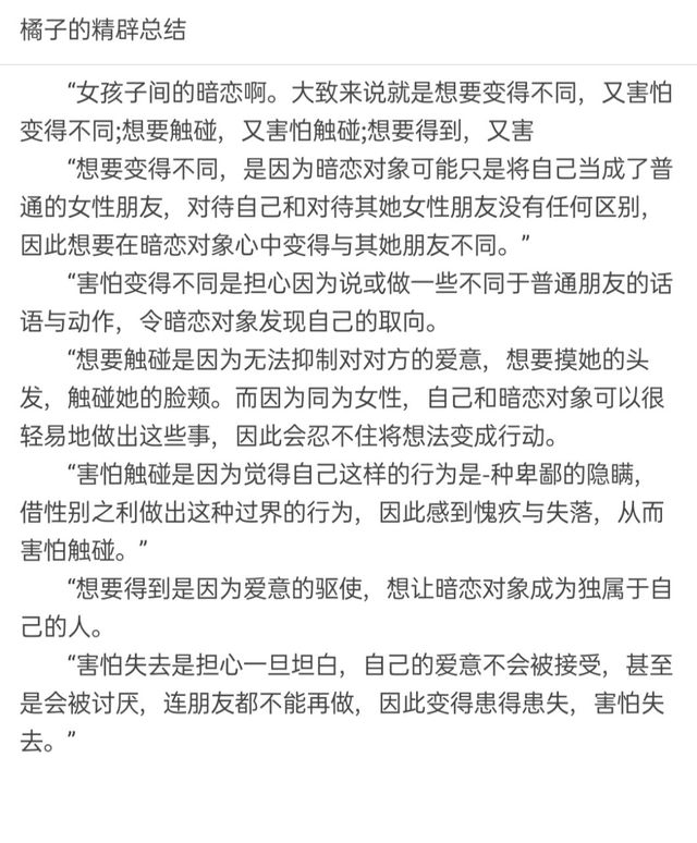 “害怕触碰是因为觉得自己这样的行为是-种卑鄙的隐瞒,借性别之利做出这种过界的行为,因此感到愧疚与失落,从而害怕触碰。”