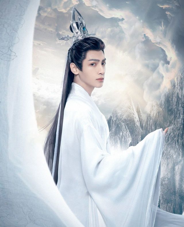 龙君一袭白色云锦华袍,身姿欣长,配以白玉流苏,腰身纤细,广袖翩然。