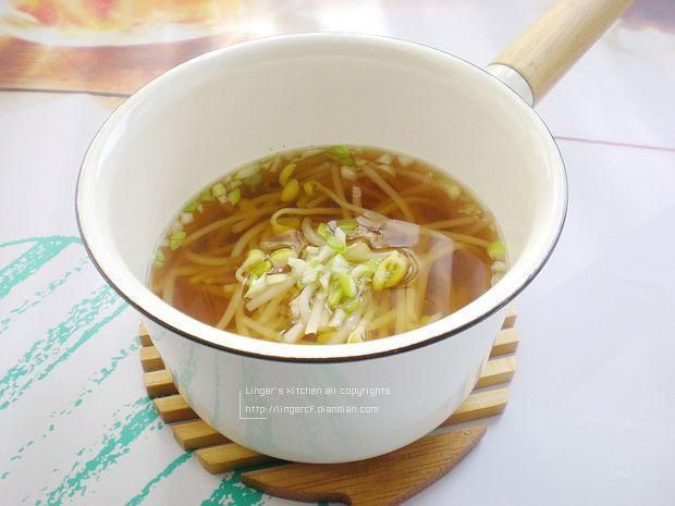 锅中加了三杯杯清水大火烧开,放入洗好了的豆芽、蒜粒,再沸后改小火煮七八分钟后,调入盐、生抽和胡椒粉,等水再次烧开,然后熄火撒葱花。