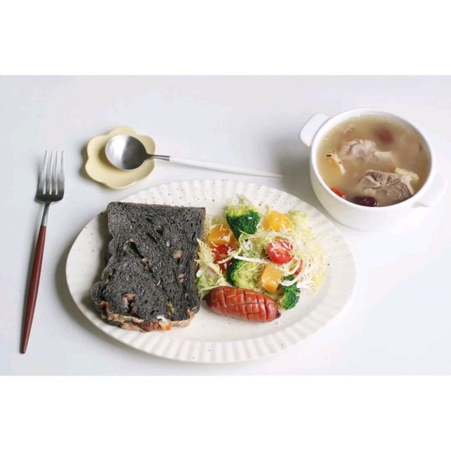 趁着煲汤的时间,方媛煎了香肠,也凉拌了一份蔬菜沙拉配着杂粮面包,早餐就准备好了。