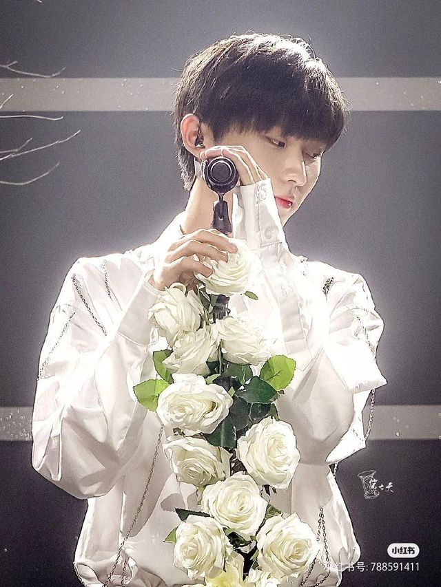 马嘉祺站在舞台上唱歌,光正好照在他的身上,像一只圣洁的白玫瑰