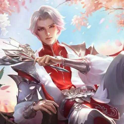突然诸葛亮从桃林深处走出,身穿白色红边的华服,白色头发清丽绝伦,手持羽扇掩面轻笑。