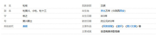 杜牧(803年—852年),唐京兆万年(今陕西西安)人,字牧之。杜佑之孙。唐代文学家 、大和进士。历任淮南节度使掌书记、监察御史、宣州团练判官、殿中侍御史、内供奉、左补阙、史馆编撰、司勋员外郎以及黄、池、睦、湖等州刺史。晚年尝居樊川别业,世称杜樊川。