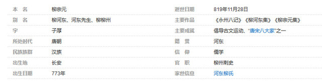 柳宗元(公元773年—公元819年11月28日),字子厚,汉族,河东(现山西运城永济一带)人,唐宋八大家之一,唐代文学家、哲学家、散文家和思想家,世称“柳河东”、 “河东先生”,因官终柳州刺史,又称“柳柳州”。