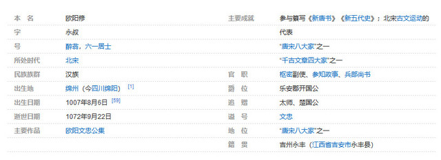 欧阳修(1007年8月6日-1072年9月22日),字永叔,号醉翁,晚号六一居士,吉州永丰(今江西省吉安市永丰县)人,景德四年(1007年)出生于绵州(今四川省绵阳市),北宋政治家、文学家。
