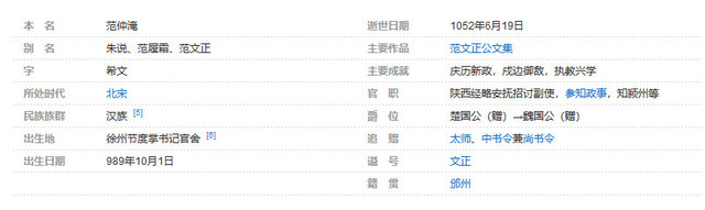 范仲淹(989年10月1日-1052年6月19日 ),字希文。祖籍邠州,后移居苏州吴县。北宋时期杰出的政治家、文学家。