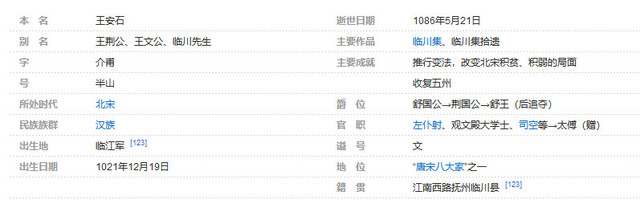 王安石(1021年12月19日 [129] -1086年5月21日 [123] ),字介甫,号半山。抚州临川(今江西省抚州市)人 [1] [123] 。中国北宋时期政治家、文学家、思想家、改革家。 [2]
