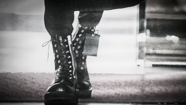 黑色风衣,浅色毛衣,马丁靴。