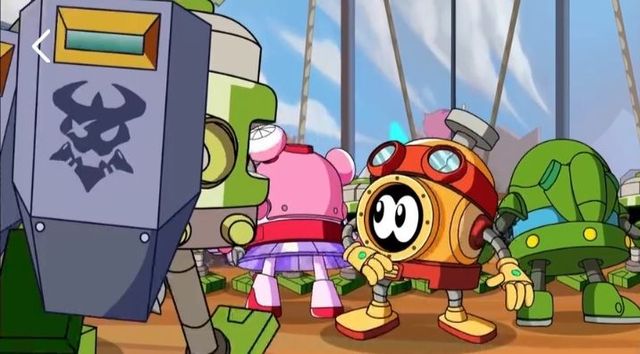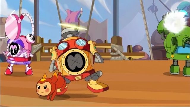卡璐璐见此,紧急跑上台来 ,启动头顶的开关 ,向正在围攻阿铁打的两个海盗攻击 !