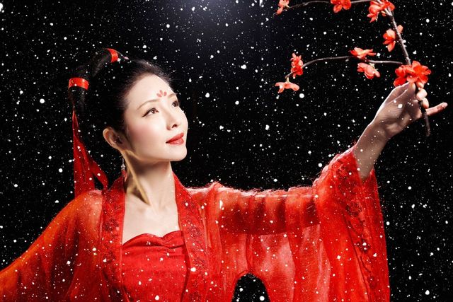 那一座屏风一个舞台,旁边闻到的是梅花的香味,下面是亮亮红灯,敏敏一身红衣,手里拿着腊梅,缓缓出现。