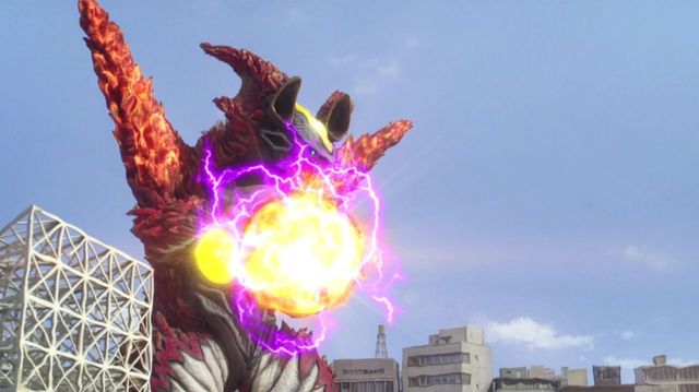 杰庞顿移动途中,直接发动了三个技能,双手在胸口揉搓,凝聚出一颗带有紫色闪电的能量光球,并张开大嘴,从口中射出一颗颗温度极高的火球,同时从头部两侧庞敦脑袋的口中射出紫色螺旋光线。