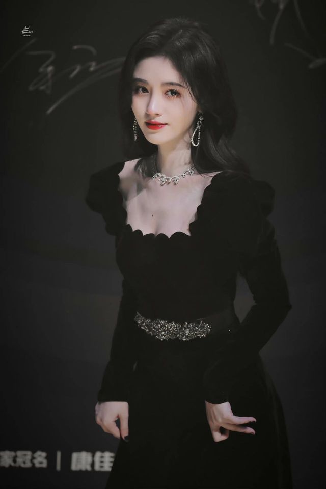 江婳是最后一个出场的,她一改平常偏温柔清纯风的妆容,这次画了比较展现气势的浓妆,微微上扬的红唇,贴着脸颊的卷发,略显夸张的耳饰配上一袭黑色,加以明亮的装饰,裙摆上的镂空蕾丝,面料上暗花点缀的晚礼服,给人冷艳、神秘、高贵的感觉,尽显楚楚动人。