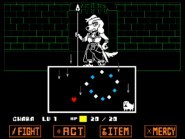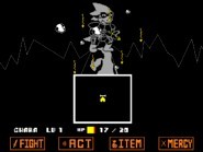 由于训练,他更强大,但仍然可以使用因果报应以及随着时间的推移造成的伤害。普通攻击可以造成更多伤害并具有暂时的无敌,而随着时间的推移造成的伤害仍然每帧造成 1 点伤害并且需要更多的注意力。仍然有 Gaster Blasters,重力操纵,使用捷径旅行。事实上,他使用这个技能来监视Alphys和Toriel。