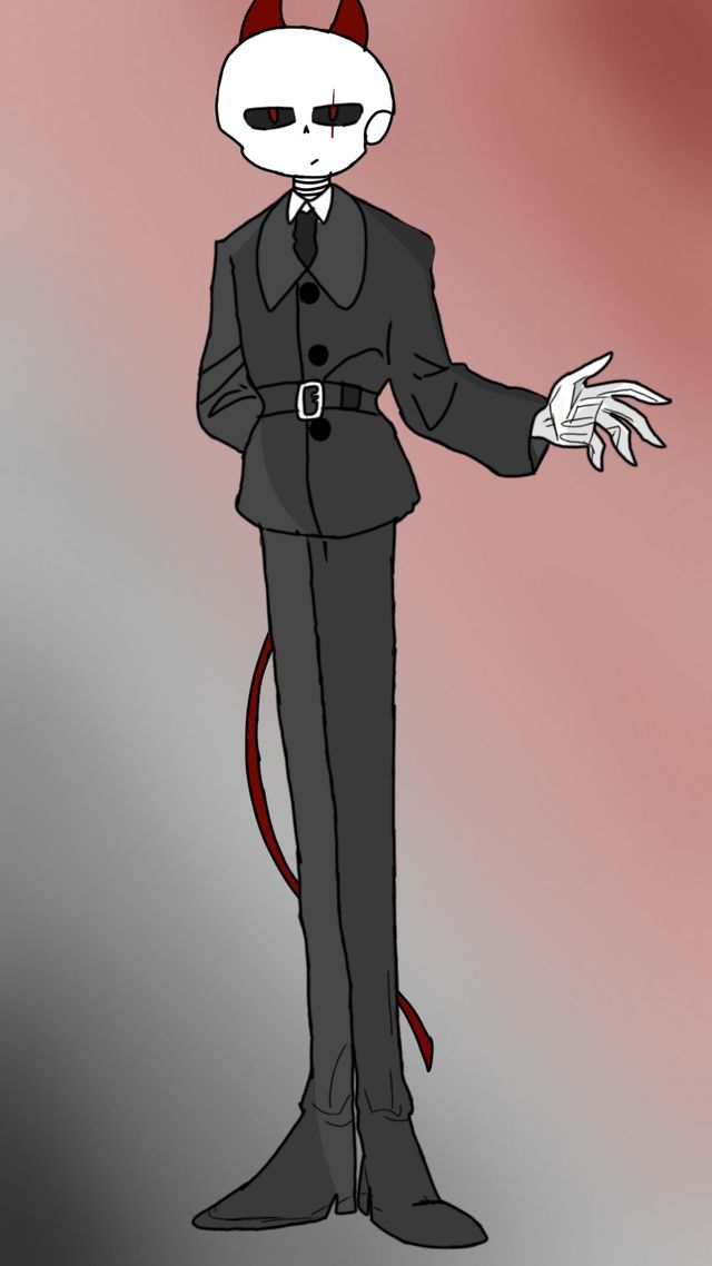 穿着黑色西装,红色的眼睛,头上有两只角,左眼上有一道伤疤,带着白色手套,腰部系着一条腰带,面部看起来像骷髅,有一条如同刀般锋利的尾巴。