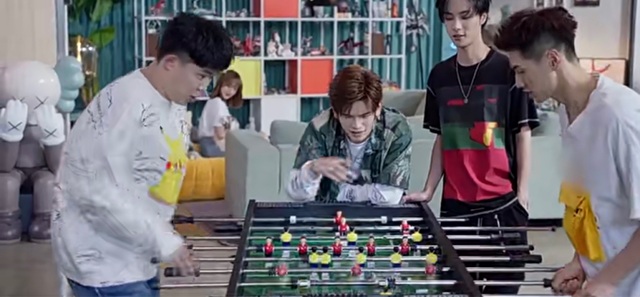 小胖、陆岳、老K、老猫四人两人一组,轮流替换上场操纵球杆,在桌面球场上进行着激烈的比拼。