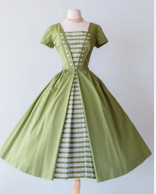 她扶着楼梯的扶手,穿着绿色的敞篷裙,中间还有一排斜着的白色扣子,扣子中间是绿白相间的三角形。