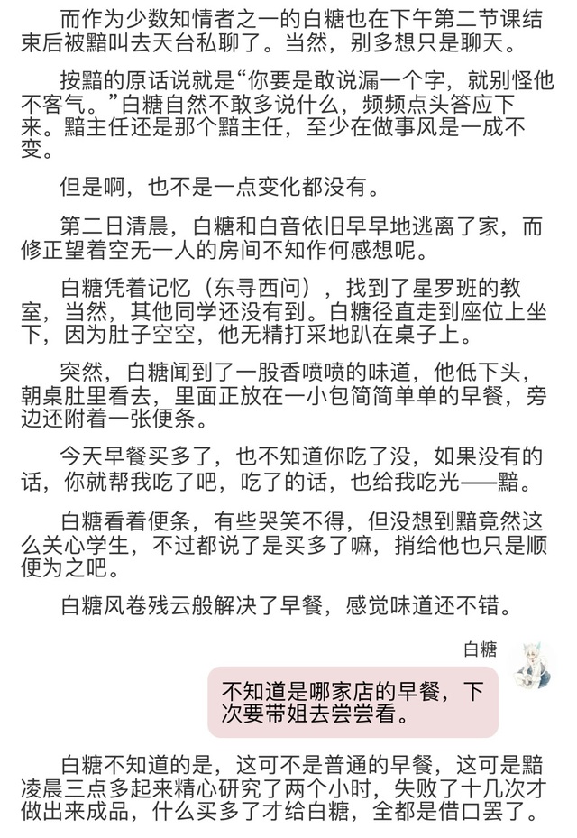 有一次,白糖上课时走了会儿神,好巧不巧就被墨兰叫到回答问题,白糖扭扭捏捏站起身,他根本不知道墨兰讲到哪里,只能向武崧求助,武崧呢也很爽快地告诉了白糖答案。