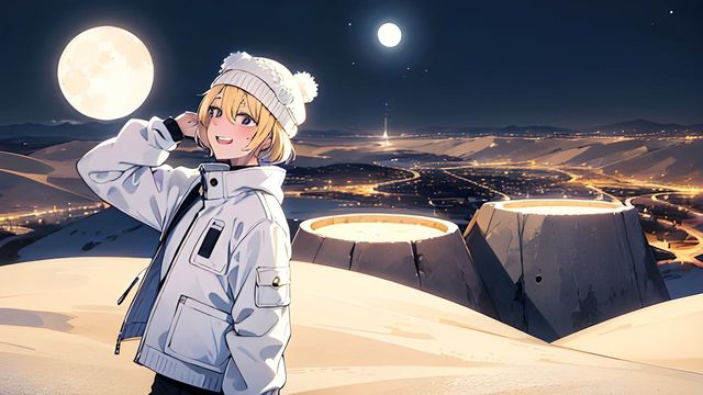 凌晨时分,一位身材高挑的金发少女看着天空中明亮的圆月,走在路上