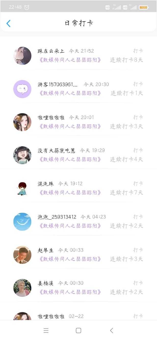 绾绾谢谢踩在云朵上的鲜花,谢谢用户_612444452的鲜花;谢谢踩在云朵上的八天打卡和混沌珠七天打卡,以及没有大蒜就吃葱的四天打卡,啦啦啦啦啦和赵琴生三天打卡,泡泡_259313412和姜楠溪的两天打卡,还有游客_157063961的打卡,还有很多没有出现在截图上的各位打卡的宝贝们,我都看到了,不好整理,就不发出来了,谢谢大家的支持,爱你们呐!
