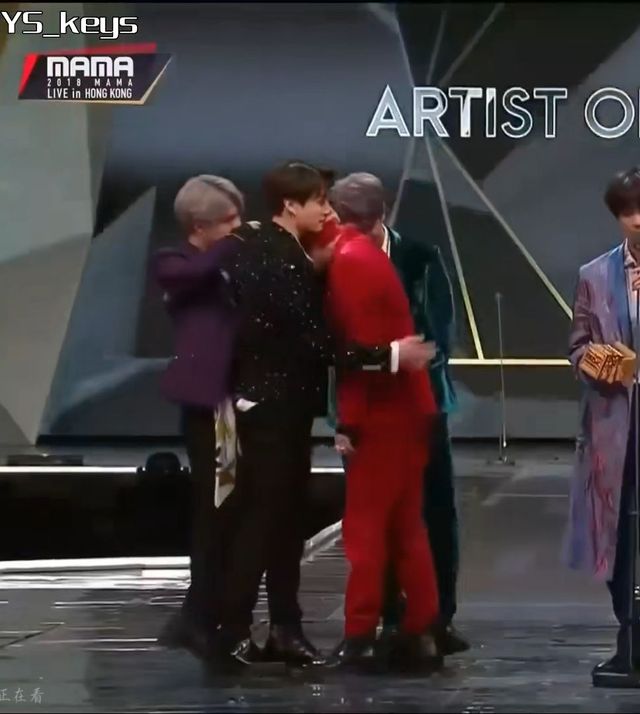 表演结束,防弹不负众望获奖了,大家上台演讲,第一个是号锡,可是永远是气氛担当的号锡说两句居然哭了,搞的身后朴智旻也跟这流泪,然后发言的是,智旻,泰亨,玧其到了大哥金硕珍发言说出了这一年过得很不容易,我们都想着要不要解散。