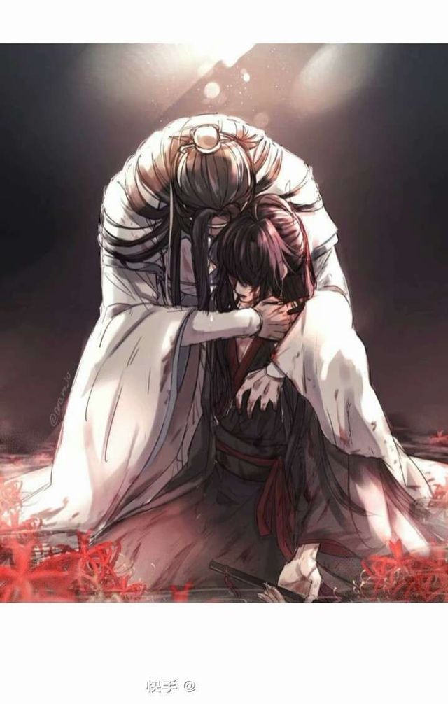蓝忘机从背后护住怀中人,呜咽的无声哭泣着双手紧紧握住,朦胧的双眼看着怀中满身鲜血的人儿喃喃诉说