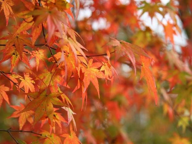 秋天的风轻轻吹过树枝发出沙沙的响声,树叶被吹的翻飞,橙红的枫叶上挂着清晨的露珠,在阳光照耀下,折射出点点璀璨的光芒