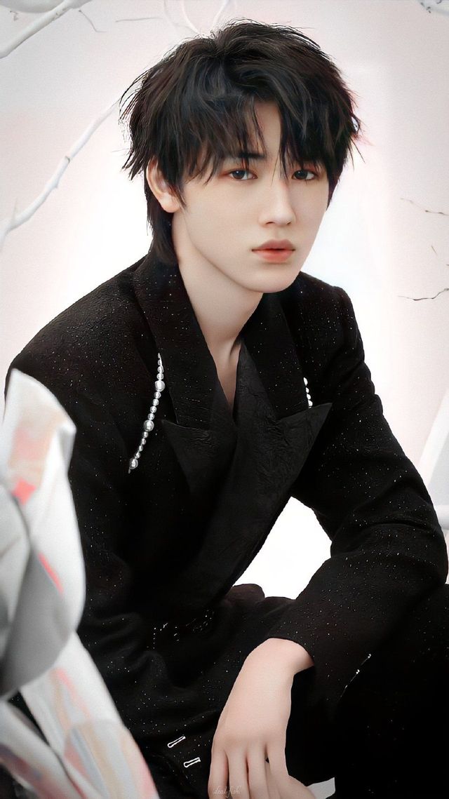 严浩翔穿着黑色西装,内衬则被他用指尖挑开了扣子,露出精致的锁骨,有几分贵气公子的风范。
