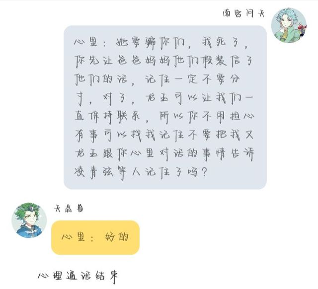南宫问天心里:她要骗你们,我死了,你先让爸爸妈妈他们假装信了他们的话,记住一定不要分寸,对了,龙玉可以让我们一直保持联系,所以你不用担心有事可以找我记住不要把我又龙玉跟你心里对话的事情告诉凌青弦等人记住了吗?