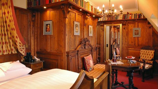 整体成棕色调,切割齐整的木板错落有致的贴着墙体,上头定有钉子,挂了许多观赏用的油画。房间中央一长方形的大床,铺了厚厚的几层鹅绒垫自,蓬蓬的,看起来就很软和。窗户上绘有圣经故事的彩色大玻璃隔绝了窗外的风景,打开窗户,刚好能眺望到海面的波澜壮阔。