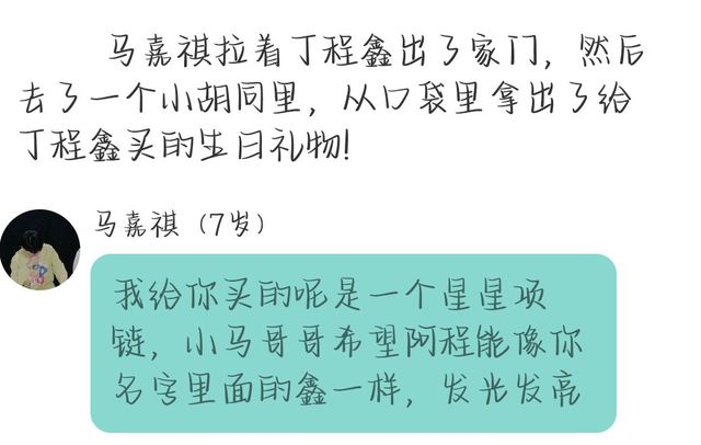 丁程鑫转过了身,背对着马嘉祺,好让马嘉祺给自己带上呢个星星项链,由于丁程鑫还太小,带着星星项链像是带了一个非常长的大链子一样!