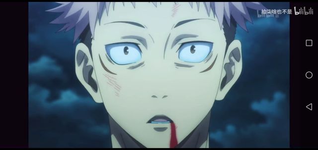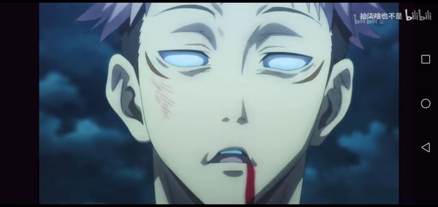 虎杖悠仁被定住,双眼茫然,眼睛下面不知道是什么东西,嘴巴留出鲜血,脸上还有伤,好像前不久刚跟人打了一架。(是的)