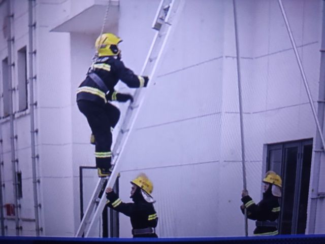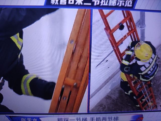 张天水那我们十五米金属拉梯是在每一个撑角都有一个消防员,啊给大家进行固定