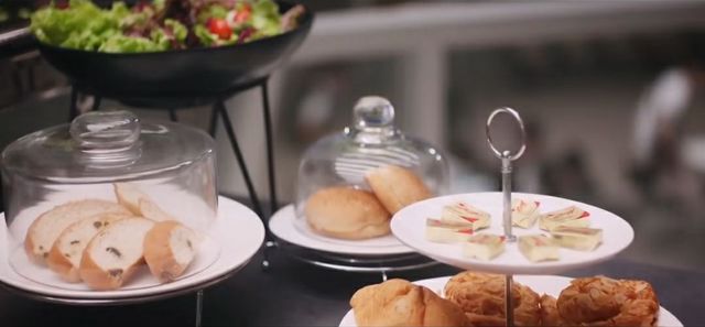 洛玖玖路上贪吃,手里拿着一款糕点一杯饮料过来。