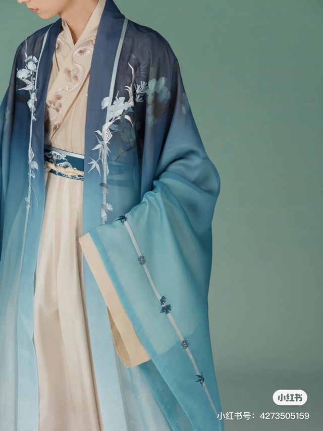 上杉青一袭蓝色渐变考斯滕,腰间银丝细绣,浪卷云舒,肩口袖口上点缀着星点水钻,营造出一种大气且从容的美感