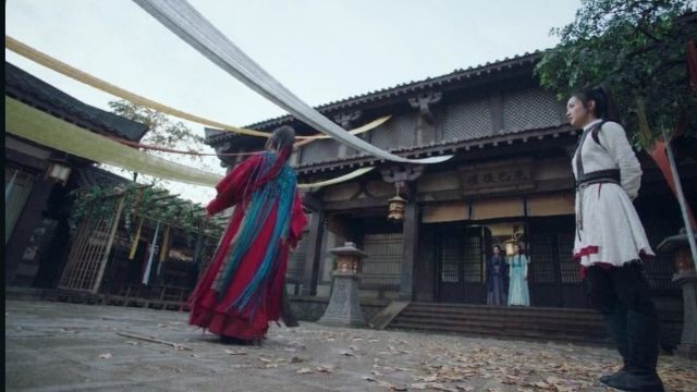 段九娘和周翡拿着两根树枝开打。周翡用着蜉蝣步,段九娘使枯荣手把周翡的树枝拿下。