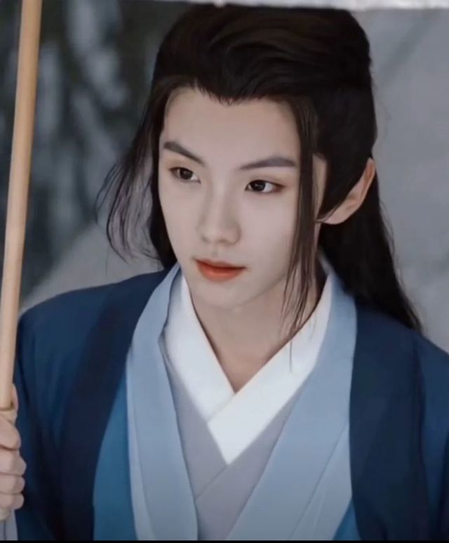 马嘉祺穿好衣服,是蓝色的汉服,白色作为花边装饰,拿着一把伞,很好看。