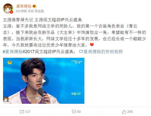 随后王源上台为大家推荐超级IP猫腻的《择天记》,王源说差不多他自己就是网络文学的同龄人,第一个古装角色来自《青云志》,接下来也会在新作品《大主宰》中饰演牧尘一角。