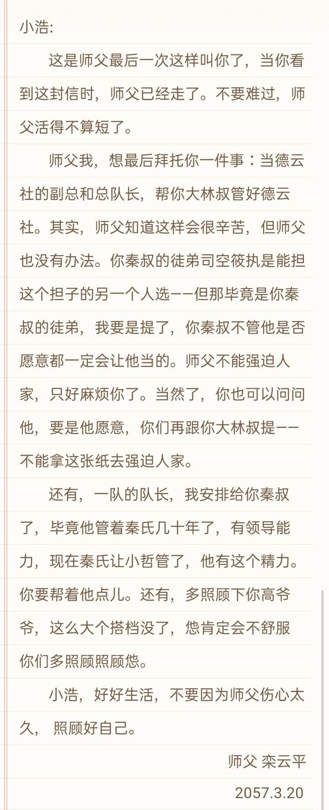 高筱贝从包里拿出栾云平留给他的最后一封信:“信在这里,您和秦叔还有司空可以看看。”