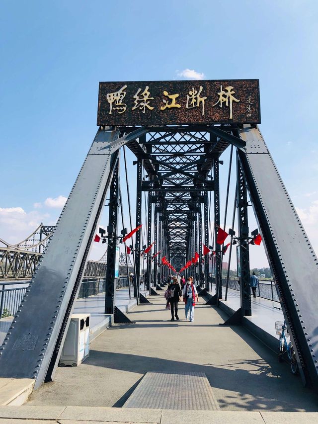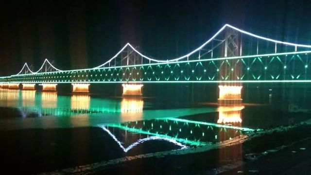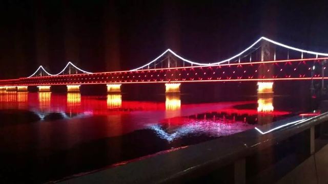 你们二人下车,来到鸭绿江大桥看对面朝鲜的景色。