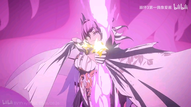 爱莉希雅踩在沙发上,摆出一副拉弓搭箭的姿势,口中大声念叨着电视机里刚放完的电影中【绚丽摇摇花】最后的台词,中二无比。